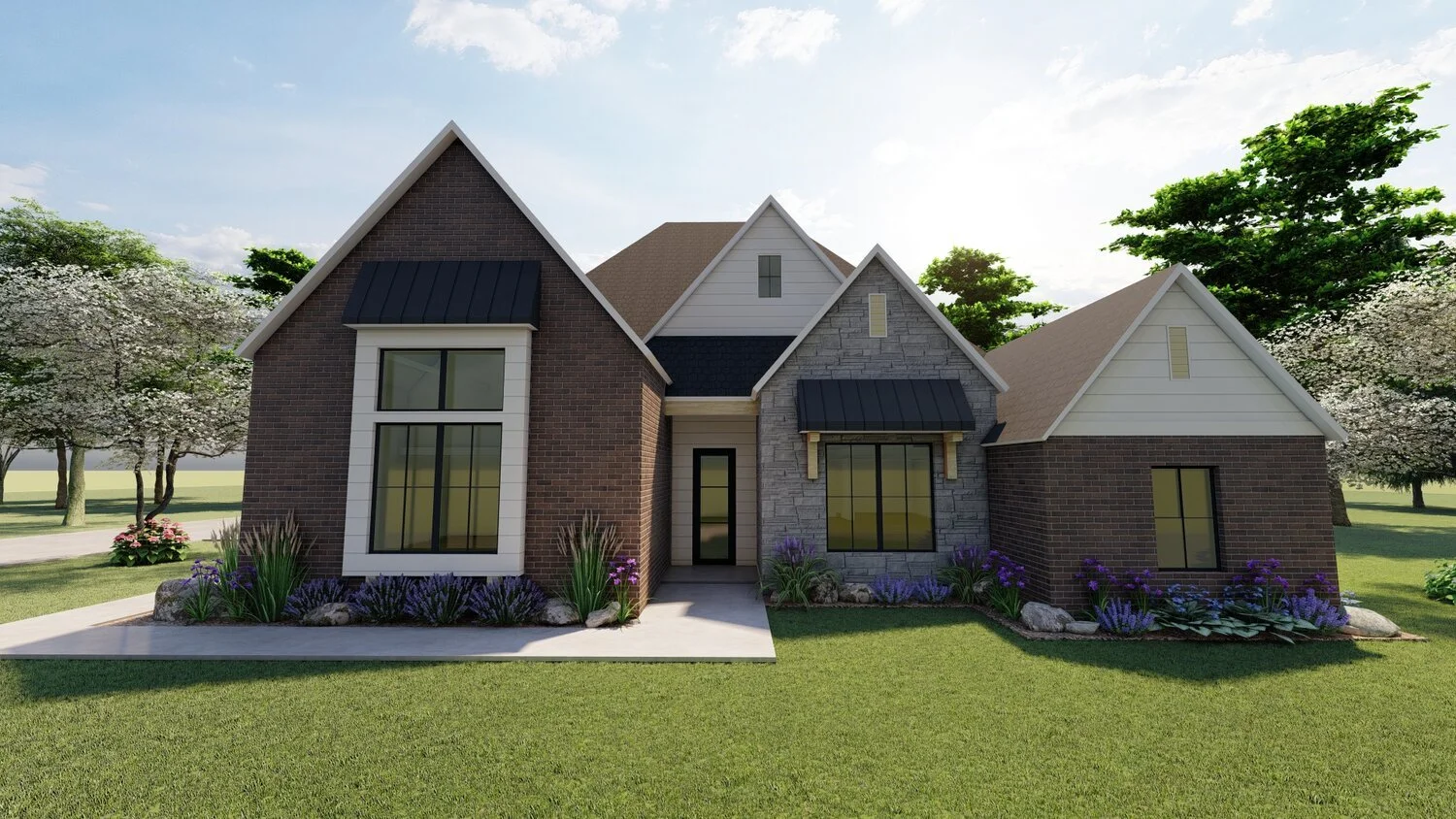 With a unique and balanced blend of sustainable materials, this design is truly original and refreshing. Large straight-line windows and picture windows allow lots of natural light into the plan making this a desirable design for homebuyers. Pops of black keep this plan on-trend for 2022 with handsome standing seam awnings and black framed windows and doors.